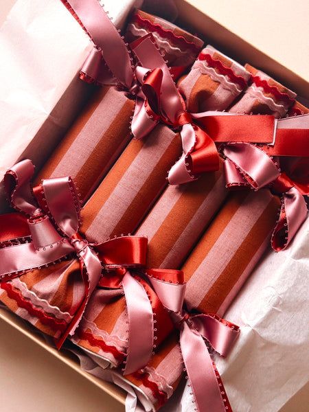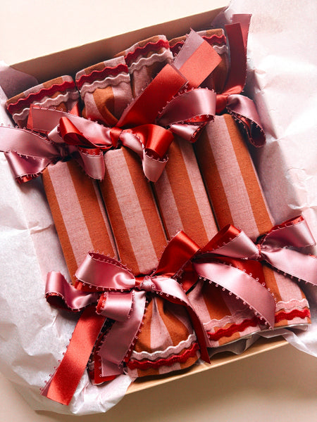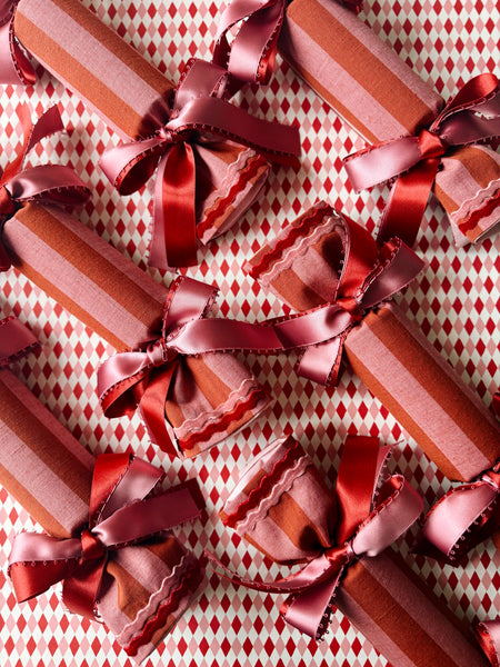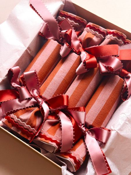 Blush Pink and Burnt Berry Cotton/Linen inspired by colourful Candy Canes. A show stopping cracker for any table, tree, stocking or Christmas Eve box.