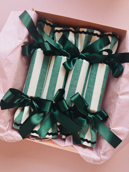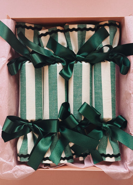 Perfect matched with our new updated 2025 Santa Stripes. Soft off white and Forest Green Cotton/Linen inspired by those hardworking Elves. A show stopping cracker for any table, tree, stocking or Christmas Eve box.