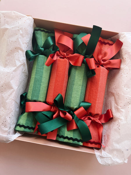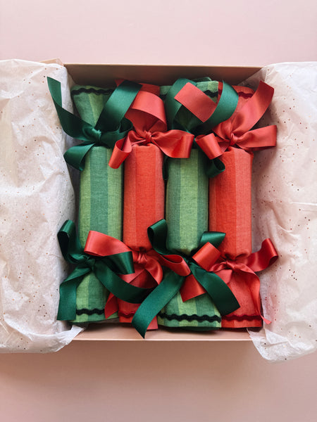 Each Cracker is handmade to order and comes fully assembled on arrival. In your box, you'll also find a small bag of our New and Updated 'Happyfetti' to use with your crackers, use it inside the carton or inside the fabric. Every Cracker Set comes with a sturdy heirloom gift box that will keep them dust free and fresh for years to come. (Individual Crackers come wrapped).